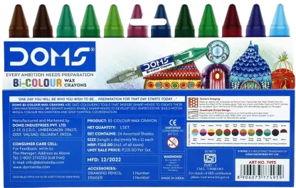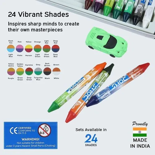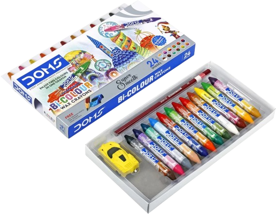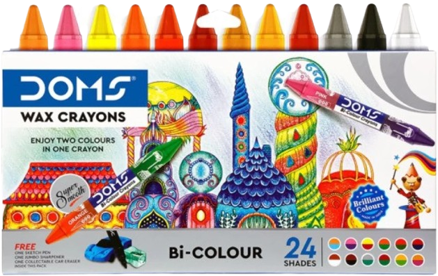 Doms 24 Shades Bi-Colours Crayons (Two Colours In One Crayon). Give your budding artist a creative start with Doms Bi Colour Wax Crayons. It comes in a variety of colours to allow your kid’s creativity pour on paper. Smooth to use and with an excellent colour pay off, these allow maximum usage. Rich bright colours. Even colour Shading. Smudge free. The colors have a smooth colouring texture. The crayons have two shades in one crayon. The colors come in 24 assorted shades.